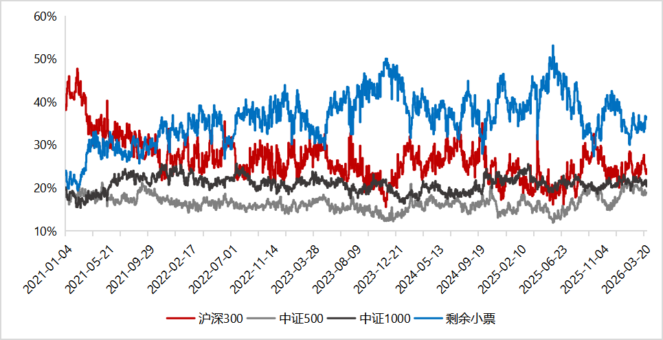 1-2月的主線抱團(tuán)板塊在3月出現(xiàn)回調(diào),杠桿資金對于地緣沖突更為敏感,市場的流動(dòng)性分布趨于均衡,1800以外的成交占比逐漸回升至35%以上,中證500的成交占比明顯回落,中小票的成交占比距離歷史中樞仍有一定距離,當(dāng)前擁擠度處于低位,流動(dòng)性層面仍有相當(dāng)?shù)男迯?fù)空間。