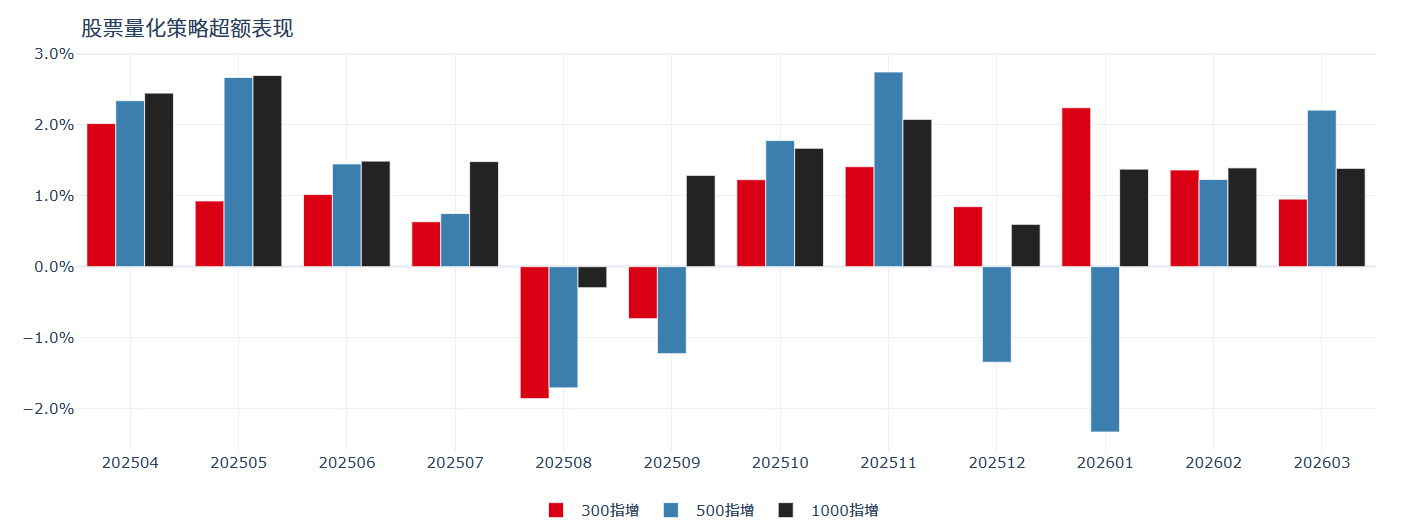 股票量化策略的超額在3月持續(xù)修復(fù)。在地緣沖突的影響下,市場逐漸切換至低波、低流動(dòng)性的績優(yōu)股進(jìn)行防御,不論是量價(jià)風(fēng)格(動(dòng)量、波動(dòng)率、流動(dòng)性)還是基本面風(fēng)格(盈利、杠桿)都在逐步回歸,風(fēng)格端利好量化策略尤其是中低頻策略獲取超額;同時(shí),權(quán)重股的抱團(tuán)結(jié)構(gòu)也有所瓦解,個(gè)股相對寬基的強(qiáng)弱出現(xiàn)修復(fù);流動(dòng)性層面,雖然市場的日均成交額降至2.3萬億,但絕對流動(dòng)性仍舊充裕,小票上的成交占比相比2月有所回暖,流動(dòng)性仍在,但宏觀事件成為主導(dǎo)市場的因素,個(gè)股之間的分化度回落,量化策略迎來“高勝率 + 中等賠率“的市場環(huán)境,不同類型管理人的超額均有明顯修復(fù)。
