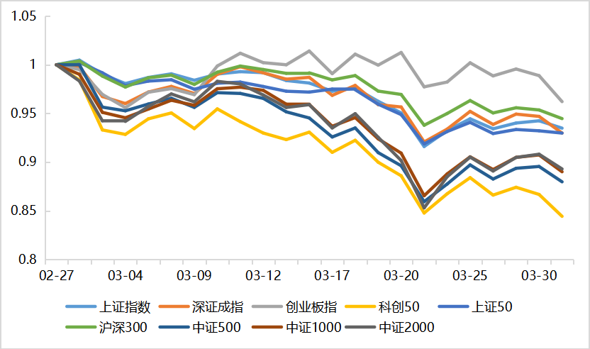 3月的A股,以震蕩下行為主基調(diào),三大核心指數(shù)全線收跌,市場經(jīng)歷了一輪從高位回落、探底、修復(fù)再到弱勢收官的完整周期。全月市場交投保持活躍,日均成交額2.33萬億,在地緣沖突的影響下,多空雙方激烈博弈,油價(jià)上升帶動(dòng)通脹上行,美聯(lián)儲(chǔ)降息預(yù)期削弱,科技和小盤股首當(dāng)其沖,科創(chuàng)50領(lǐng)跌,3月下跌15.57%,中證1000、中證2000跌幅均超10%,有色、貴金屬板塊的反轉(zhuǎn)也使得中證500指數(shù)強(qiáng)勢不再,單月下跌12.02%,大盤寬基防御性凸顯,滬深300僅下跌5.53%,新能源、電力板塊異軍突起,減緩了創(chuàng)業(yè)板的下跌幅度,成為3月最強(qiáng)寬基。