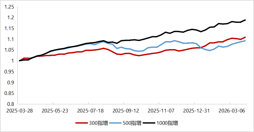 3月,隨著有色、通信等前期強(qiáng)勢板塊的回調(diào),中證500指數(shù)單月回撤超10%,指數(shù)弱勢背景下,500指增的超額迎來快速修復(fù),單月平均超額超2%,1000指增的超額依舊穩(wěn)定,300指增由于約束成份內(nèi)為主,超額彈性相對較弱。