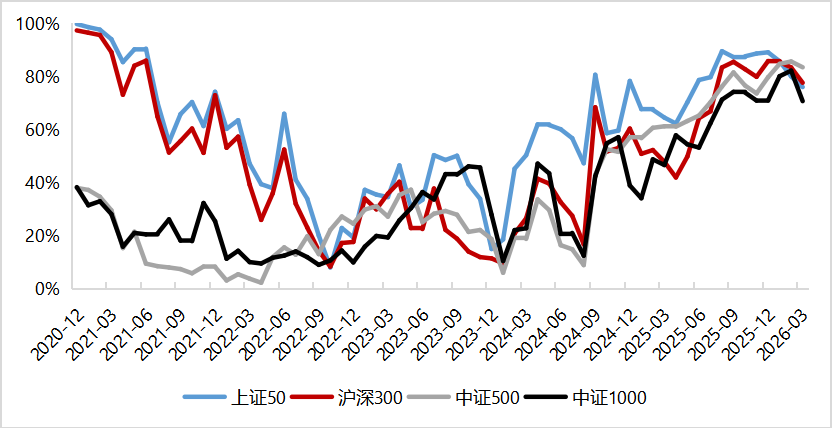 以中證500為代表計(jì)算的股債收益差近期位于歷史滾動(dòng)均值附近,自2025年9月后圍繞均值小幅震蕩,寬基指數(shù)相對債券的配置性價(jià)比處于中等水平。