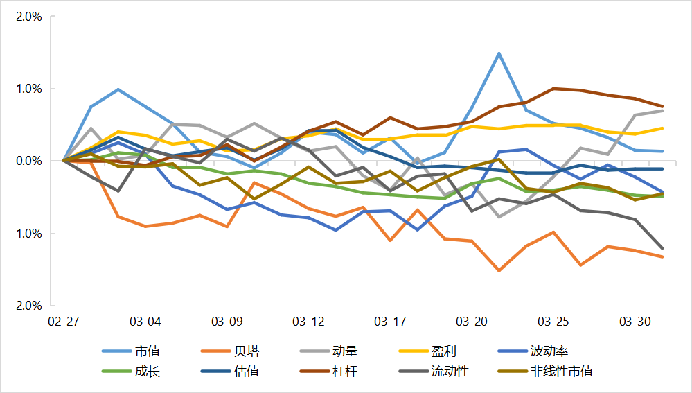 3月,外部擾動(dòng)影響之下,風(fēng)格出現(xiàn)明顯反轉(zhuǎn),全球風(fēng)險(xiǎn)偏好下行,通脹導(dǎo)致降息預(yù)期減弱,小盤股及科技板塊受影響最大,大市值風(fēng)格本月占優(yōu);量價(jià)風(fēng)格反轉(zhuǎn),動(dòng)量風(fēng)格+0.69%,低波低流動(dòng)性風(fēng)格回歸,流動(dòng)性風(fēng)格下跌1.21%;基本面風(fēng)格持續(xù)回暖,盈利、杠桿風(fēng)格收益為正,估值強(qiáng)于成長,大部分風(fēng)格回歸到了長期的方向上,風(fēng)格端環(huán)境偏好。